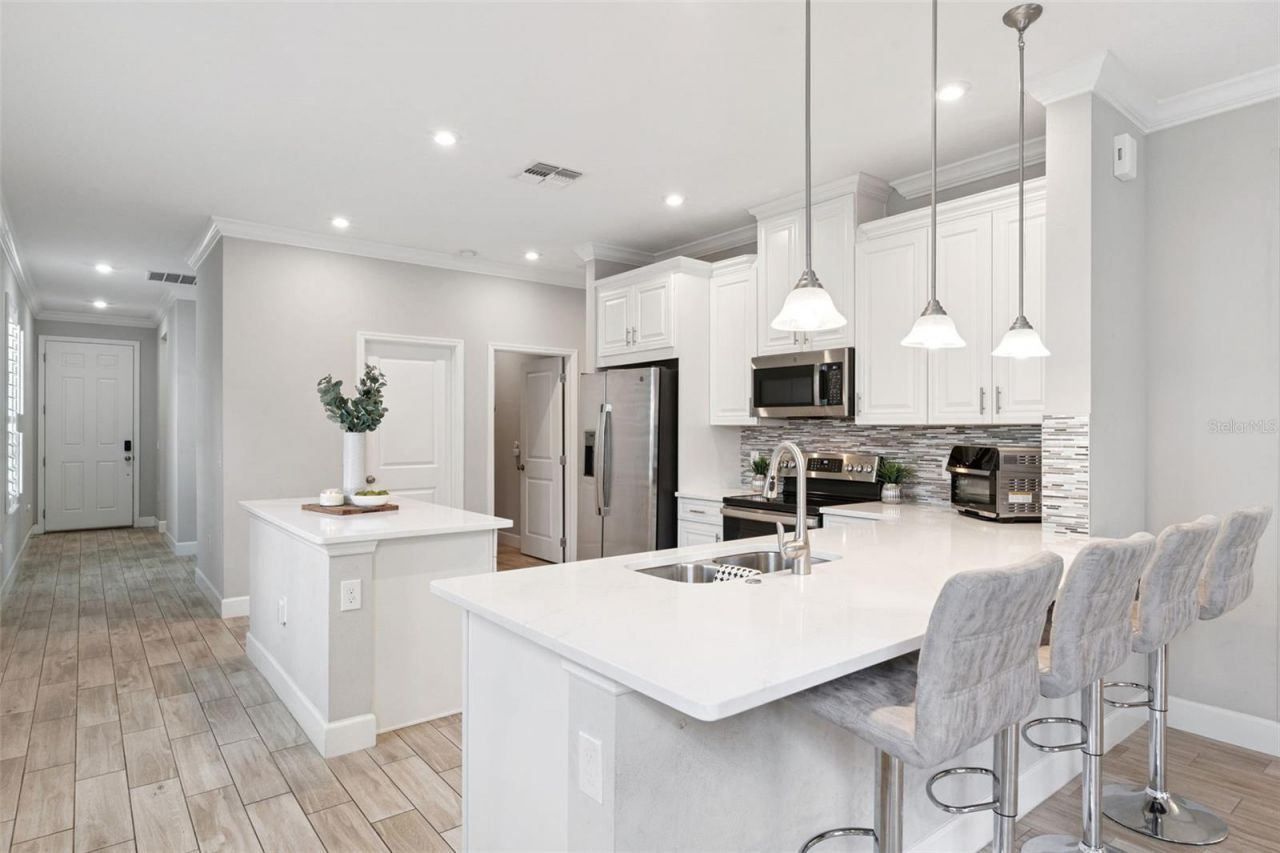 Welcome to 1174 Wildmeadow Run in Winter Park's gated Hawk's Crest community. Located on a quiet, non-thru street, this SINGLE-STORY residence offers modern construction, refined finishes, and a comfortable, well-designed layout in the heart of Winter Park. Built in 2021, the home was thoughtfully planned for everyday living and easy entertaining. The open-concept design feels light and welcoming, featuring WOOD-LOOK TILE FLOORING, crown molding, recessed lighting, CUSTOM PLANTATION SHUTTERS, and ENERGY-EFFICIENT DOUBLE-PANE WINDOWS throughout the main living areas. At the center of the home, the kitchen is both functional and inviting, offering quartz countertops, stainless steel appliances, white cabinetry with crown molding, a custom backsplash, a PREP ISLAND, and a SECOND LARGE ISLAND WITH SEATING that naturally draws people together in the living and dining spaces. Just off the main living area, a FRENCH-DOOR FLEX ROOM provides a quiet, flexible space that works beautifully as a formal dining room, home office, or additional living area. The primary suite is positioned for privacy and offers a relaxing retreat with a TRAY CEILING, generous walk-in closet, and a well-appointed en-suite bath featuring a dual-sink quartz vanity, upgraded cabinetry, and a GLASS-ENCLOSED WALK-IN SHOWER. Two additional bedrooms are well positioned in this split plan and share a FULL BATHROOM WITH A TUB AND SHOWER COMBINATION and a QUARTZ VANITY, while a SEPARATE HALF BATH WITH PEDESTAL SINK is conveniently located for guest use. A TRIPLE SLIDING GLASS DOOR opens from the main living area to a COVERED REAR LANAI overlooking a FULLY FENCED BACKYARD with room to accommodate a FUTURE POOL, creating an easy indoor-outdoor connection that's ideal for morning coffee, relaxed evenings, or casual gatherings. Additional features include a two-car garage with built-in storage, BRICK PAVER DRIVEWAY, TERRACOTTA TILE ROOF, GUTTERS, smart-home and security pre-wiring, and an HVAC SYSTEM WITH AN UPGRADED IONIZATION FEATURE DESIGNED TO HELP PURIFY THE AIR. Hawk's Crest is a gated community known for its RESORT-STYLE AMENITIES, including a lakeside pool, fitness center, clubhouse, splash pad, playgrounds, walking trails, BBQ areas, and SCENIC COMMUNITY DOCKS AND BOARDWALKS. Lawn care and landscaping are included. Ideally located near Winter Park dining, shopping, and everyday conveniences. AVAILABLE FOR PRIVATE SHOWINGS.