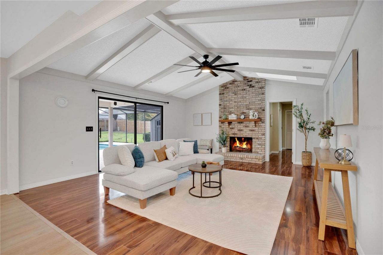 RARE FIND in the sought out Longwood community of Northridge. This show stopping POOL HOME is filled with character and thoughtful updates, offering architectural charm you don't often see. From the moment you arrive, the curb appeal sets the tone . . . welcoming, established, and full of personality. Inside, skylights and high ceilings with exposed beams bring in natural light and warmth, while a cozy wood burning fireplace anchors the main living space. Large glass slider doors frame views of the pool and backyard, creating a seamless indoor-outdoor flow. The functional SPLIT FLOOR-PLAN offers the best of both worlds, with the primary suite privately positioned on one side and three generously sized bedrooms on the other . . . ideal for multi-generational living, guests, or flexible space needs. So many updates to appreciate. BRAND NEW KITCHEN (2026) with ceiling-height cabinetry, quartz countertops, soft-close drawers, updated lighting, and a built-in bar pantry. NEW FLOORING in the kitchen and laundry (2026), FRESH INTERIOR PAINT in the main areas, updated fixtures (2026), and a fully updated bathroom. Major systems are covered with a NEW AC (2024) and NEWER ROOF (2020). The primary suite offers direct access to the pool deck, dual vanities, pocket doors for added privacy, a large walk-in closet, and a custom walk-in shower. Step outside to your PRIVATE BACKYARD RETREAT with a LARGE SOLAR-HEATED POOL, perfect for year-round living. The secondary bathroom also offers direct pool access for added convenience. An EV-READY garage adds a modern touch. Located just minutes from Altamonte Mall and Cranes Roost Park, with easy access to Interstate 4, commuting to Downtown Orlando, Winter Park, and surrounding areas is simple and convenient. Zoned for Seminole County Public Schools. This is the kind of home that blends charm, function, and updates in a way that just feels right and is ready for its next owner to enjoy from day one.